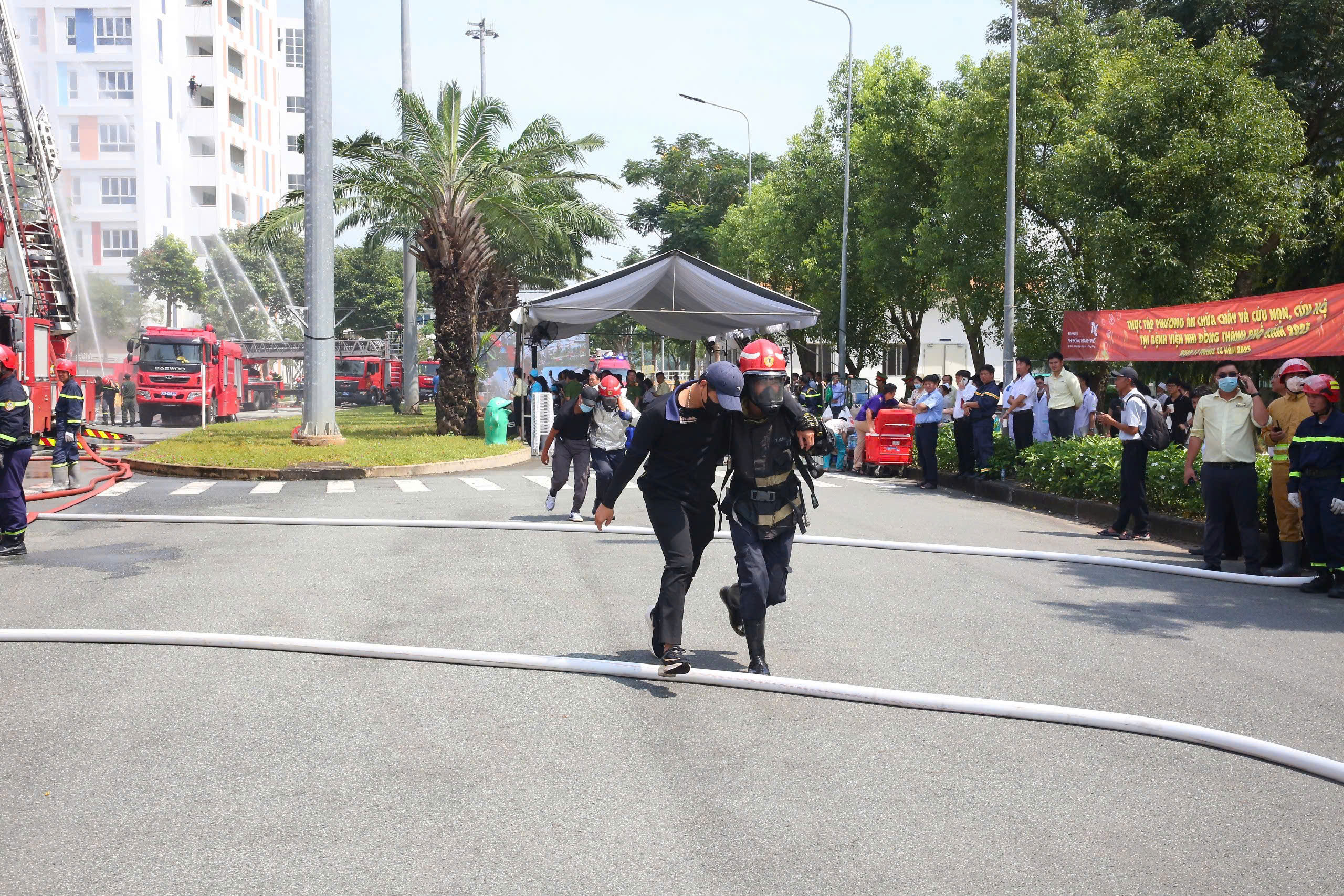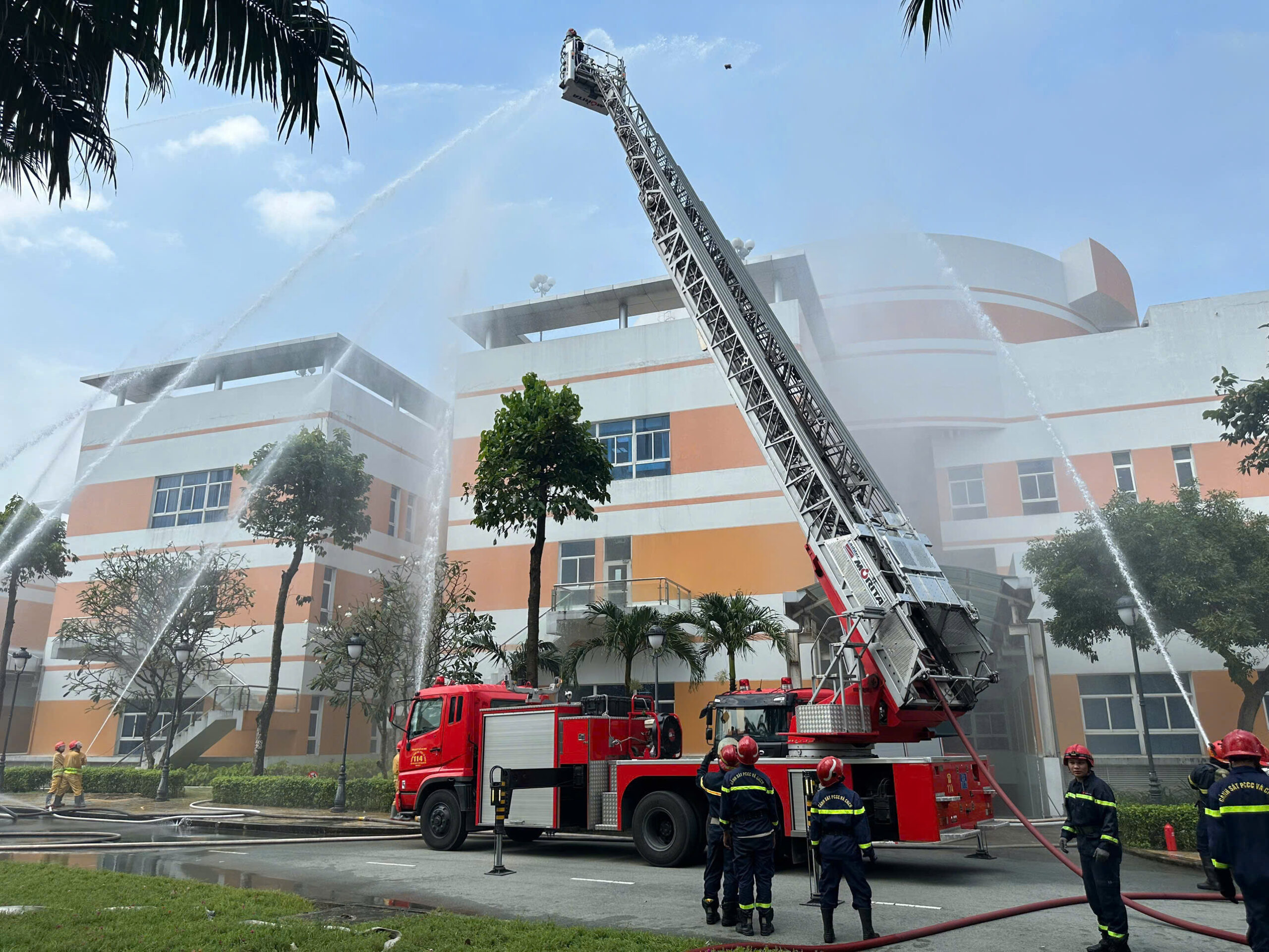 Ngày 17-10, Phòng Cảnh sát phòng cháy, chữa cháy và cứu nạn, cứu hộ (PCCC-CNCH) Công an TPHCM đã tổ chức thực tập phương án phối hợp chữa cháy và CNCH tại Bệnh viện Nhi đồng TPHCM, tại số 15 Võ Trần Chí, xã Tân Nhựt.