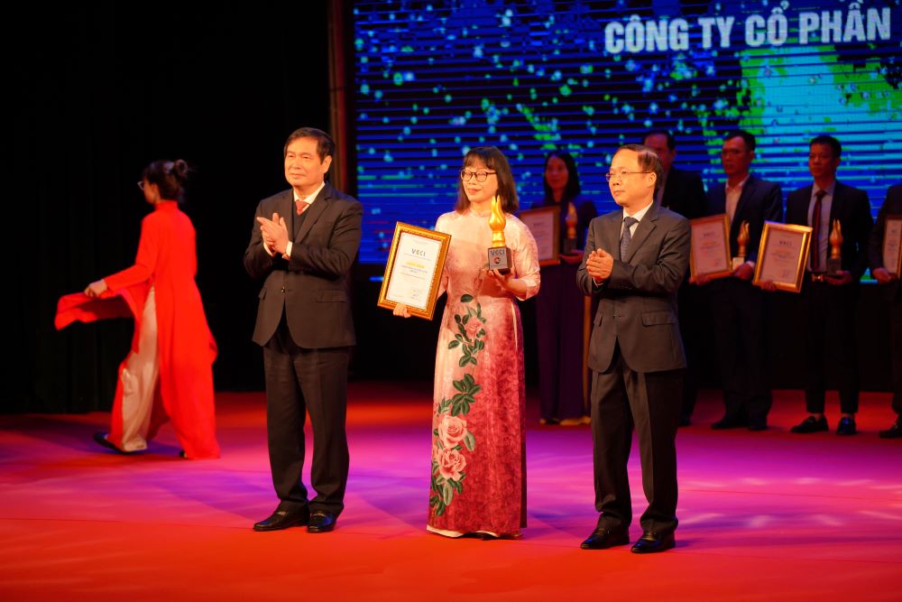 Bà Hà Thị Hòa Bình – Phó Giám đốc, Công ty Cô phần Hữu hạn Vedan Việt Nam nhận Cúp vàng “Doanh nghiệp Văn hóa, Uy tín năm 2025” do VCCI trao tặng